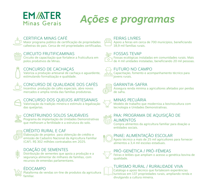 Já a política de Educação Corporativa da empresa permitiu, somente em 2025, mais de 280 capacitações, com a participação de quase dois mil profissionais da Emater-MG.